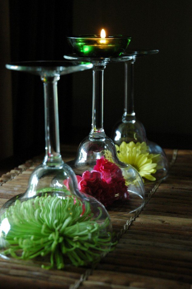 1. Pahare intoarse invers cu flori dedesubt si lumanari deasupra: