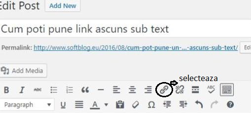 3. Selecteaza din bara de sus, de sub ”Add media” pictograma are seamana cu o agrafa (Insert/edit link), asa cum vezi in imaginea de mai jos.